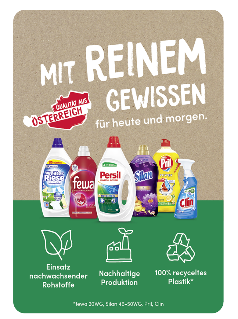Wir produzieren in Wien viele unserer bekannten Marken wie Persil, Fewa, Silan, Pril und Clin. Durch die lokale Produktion werden nicht nur Transportwege verkürzt, sondern auch Arbeitsplätze in Österreich geschaffen und erhalten. Seit 2022 setzen wir dort auch unser zertifiziertes Biomassenbilanz-Verfahren ein und setzen zunehmend Rohstoffe ein, die aus Biomasse gewonnen werden. Damit werden in Wien jedes Jahr um die 4 000 Tonnen CO₂ eingespart.