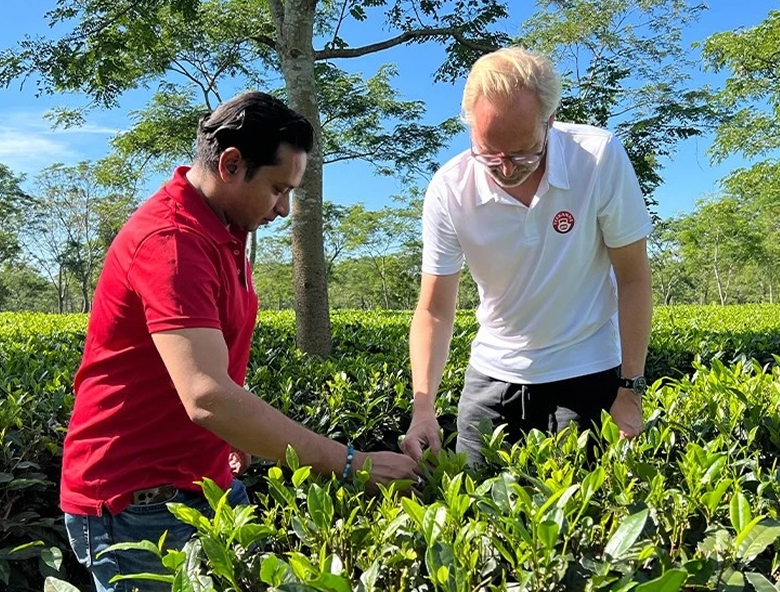 Für unsere Teemischungen beziehen wir rund 300 Rohwaren von über 150 Lieferant:innen aus 50 verschiedenen Ländern. Wir sprechen hierbei von Direktbezug auf Rohwarenbasis. Klingt selbstverständlich? Ist es aber nicht. In der Teebranche beziehen nämlich die meisten Unternehmen bereits fertige Mischungen fast ausschließlich über den Großhandel und haben keinen direkten Kontakt zu den Landwirtschaftsbetrieben im Ursprung. Der direkte Kontakt mit unseren Partner:innen ermöglicht uns, im persönlichen Austausch gemeinsam mit den Lieferant:innen Maßnahmen zur wirksamen Reduktion von Emissionen im Anbau und der Verarbeitung der Rohwaren zu entwickeln.