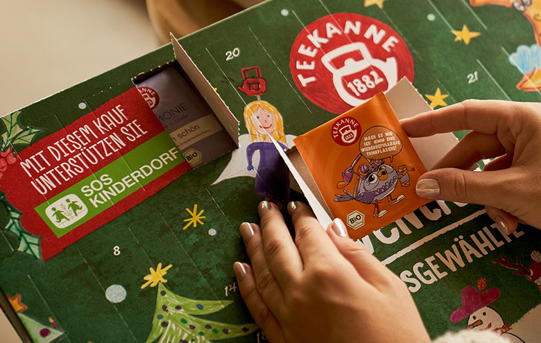 Die Kooperation mit dem SOS-Kinderdorf findet sich auch in unserem jährlichen TEEKANNE-Adventkalender wieder. Dabei wird der Reinerlös des aus Kinderzeichnungen gestalteten Adventkalenders, der 24 unserer Teesorten enthält, seit vielen Jahren an SOS-Kinderdorf gespendet.